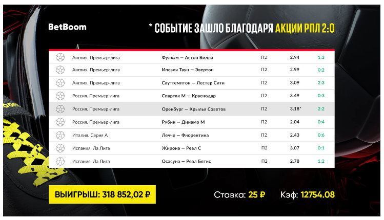 Всё благодаря акции «РПЛ 2:0», которая работает уже третий сезон. Суть просто: если команда, на которую игрок сделал ставку, поведёт с разницей в два гола в любой момент матча, букмекер выплатит выигрыш по ставке клиента в полном объёме, независимо от итогового результата игры. Раньше такое работало только для ординаров, теперь экспрессы тоже считаются.