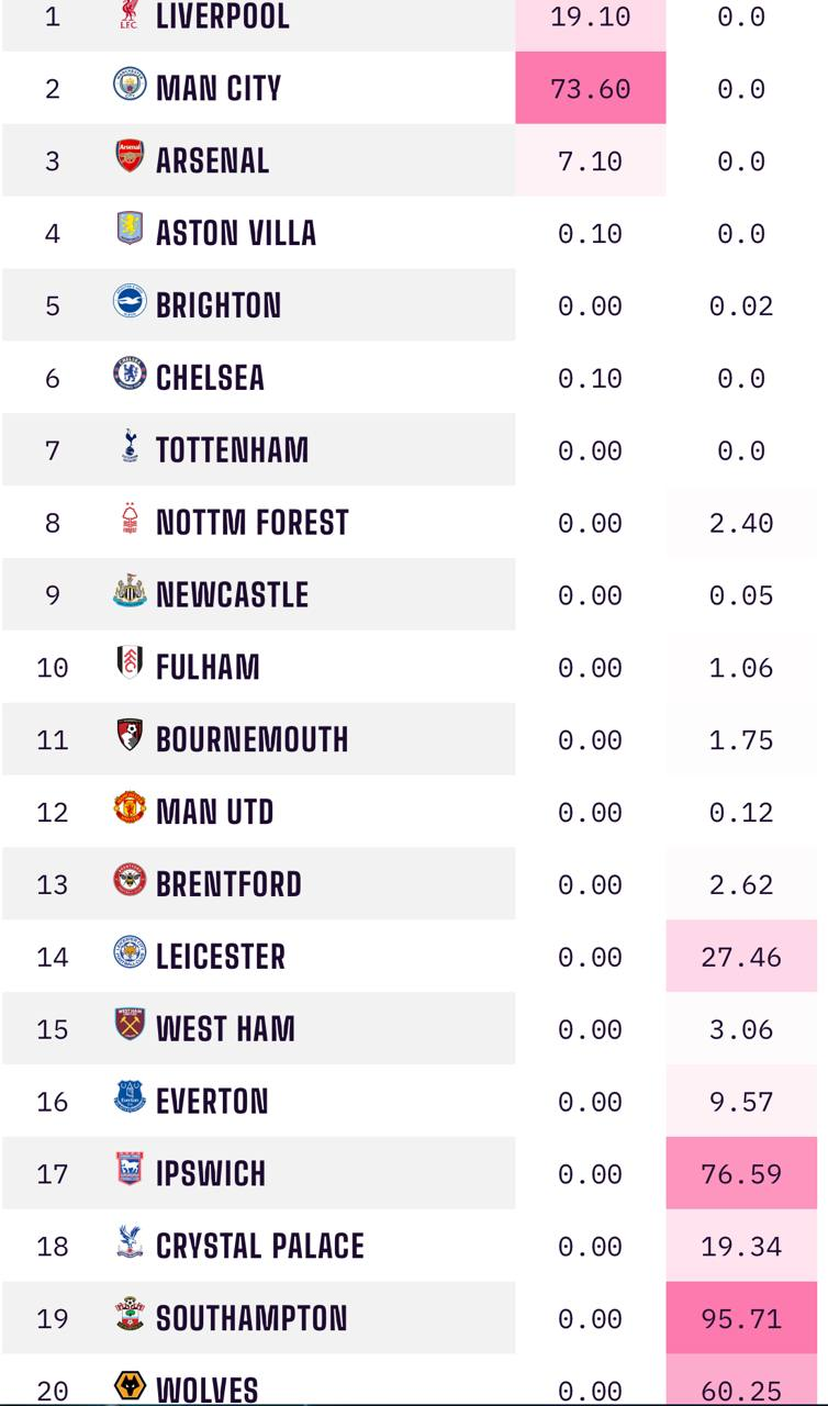 Однако суперкомпьютер не только заранее короновал «Сити» — он ещё и без колебаний назвал тройку, которая по итогам сезона отправится в Чемпионшип. В неё вошли: «Вулверхэмптон» с 60%, «Ипсвич» с 77% и «Саутгемптон» с дикими 96% — на всех остальных предлагается меньше 30%. На фоне таких цифр кэф на вылет «Саутгемптона» от букмекеров выглядит ещё по-божески: