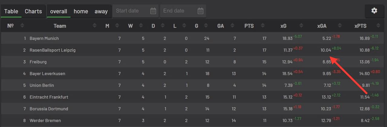 Другими словами, «РБ» абсолютно во всех турах Бундеслиги должен был пропускать больше (или хотя бы пропускать в принципе). Долго такое отклонение от нормы продолжаться не может, цифры должны прийти к ожидаемым средним значениям. Вот только вопрос — когда?