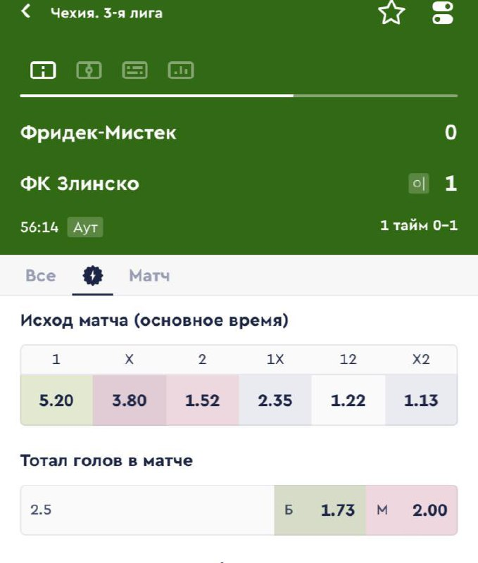 При счёте 0:1 ставка на ТБ 2,5 в игре «Фридек-Мистек» — «Злинско» моментально разлетелась по капперским телеграм-каналам с припиской «максбет» — с 57-й минуты грузили на этот исход беспощадно. Но команды решили поиграть на нервишках и до 90-й минуты не забивали. Часто в таких ситуациях букмекеры завышают тотал и держат на пункт выше даже в концовках, но не в этот раз: на 80-й в линии уже красовались 1.50 на ТБ 1,5 (даже не 2,5).