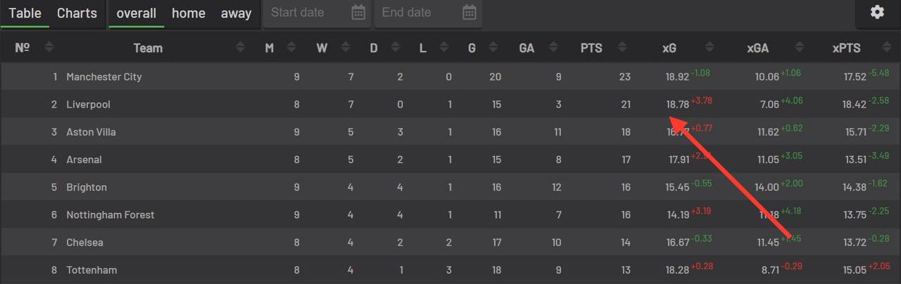 Но высокий xG не гарантирует реальные голы — спросите у «Реала». Да и сам «Ливерпуль» забил почти на четыре мяча меньше ожидаемого, хотя на дистанции топы должны оверперформить из-за высокого скилла футболистов. Выборка пока небольшая, но всё равно подсветим: у «Ливерпуля» самый большой недобор голов среди топ-8 команд АПЛ.
