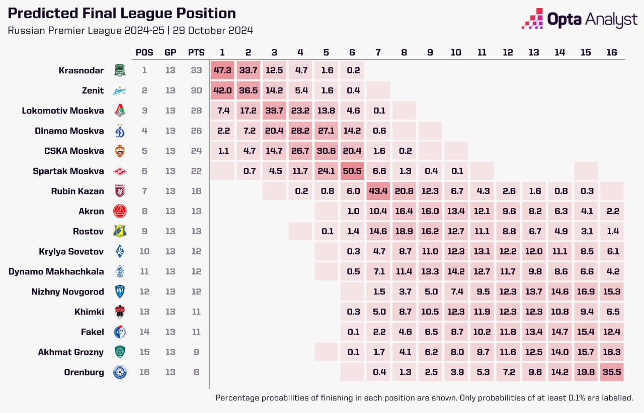 Суперкомпьютер настолько впечатлился 10 победами подряд (неспроста — такое удавалось ранее только двум клубам), что сделал «Краснодар» первым фаворитом на победу в чемпионской гонке. Титул команды Мусаева оценивается в 47,3%, то есть первое место и любое другое — это почти равные вероятности.