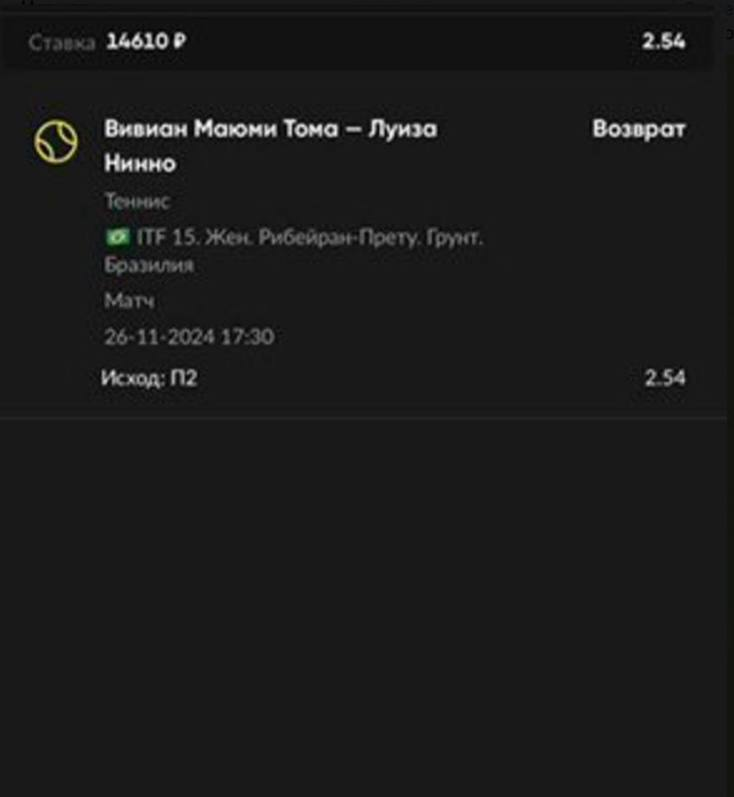 Артём Клаудио вчера зарядил-таки на свою любимую Вивиан Маюми, которая шла андердогом против 16-летней Луизы Нинно на турнире ITF в Бразилии. И ставка доехала без проблем — бразильянка победила в двух сетах.
