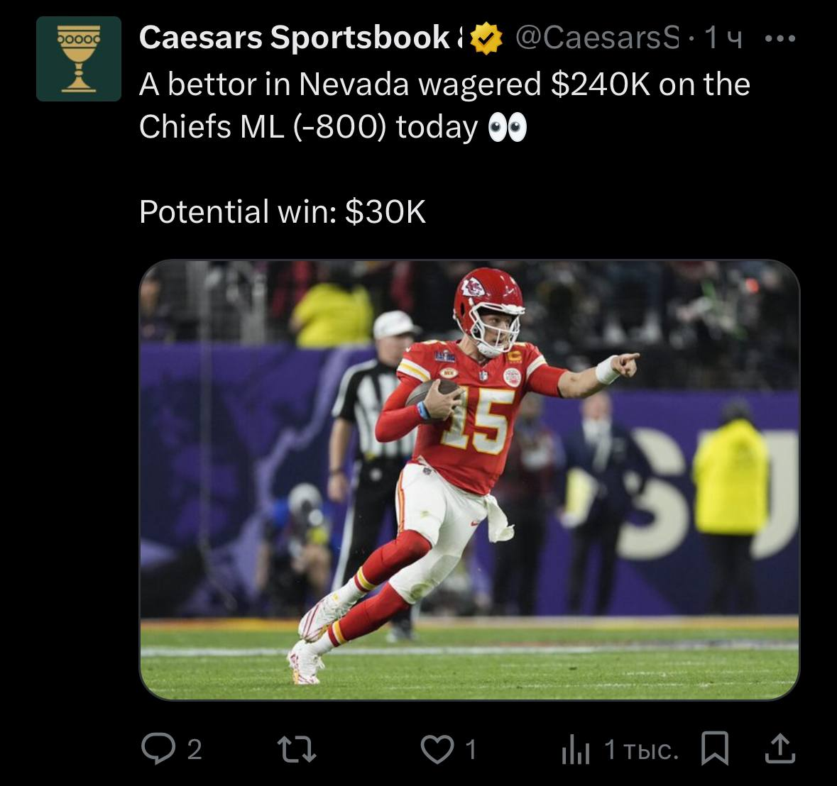 Сообщение о крупной ставке появилось в соцсетях американского букмекера Caesars Sportsbook: клиент из штата Невада загрузил 240 тысяч долларов (более 25 млн рублей) на победу «Канзас-Сити Чифс» дома над «Лас-Вегас Рэйдерс» сегодня вечером. Коэффициент — целых 1.12, потенциальный чистый выигрыш — 30 тысяч долларов (чуть больше 3 млн рублей).