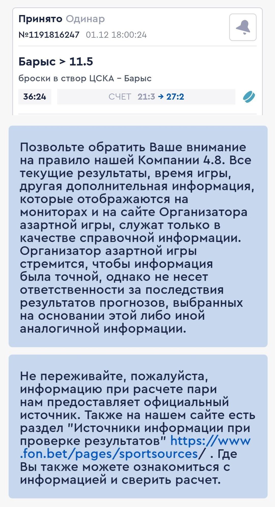 В редакцию Дейли прилетел купон на КХЛ. Как видно на скрине, автор ставки брал 12 бросков «Барыса» в матче с ЦСКА, когда у гостей уже набралось три. Но спустя пару минут казахстанцы не только ни разу не пробили, но ещё и потеряли бросок. И Fonbet в этом не виноват: статистику пересчитывает официальный сайт КХЛ, букмекер же просто снимает с себя ответственность.