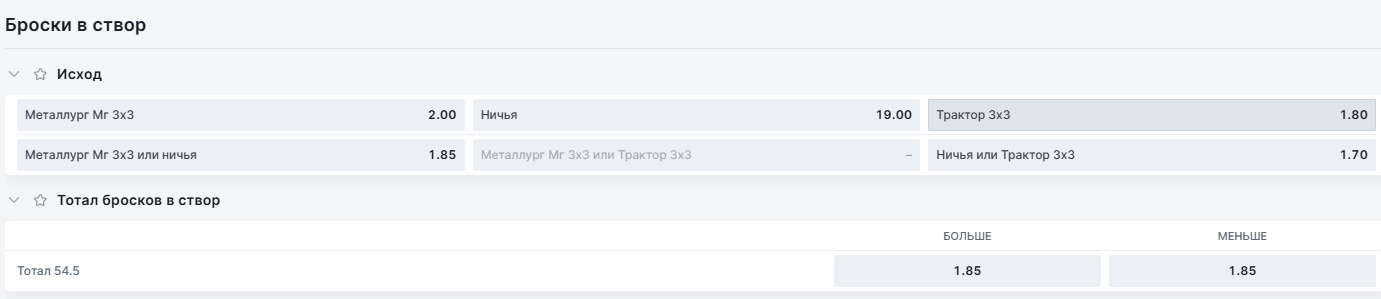 Во-первых, появился раздел со статистикой — броски в створ и вбрасывания. Максимал — 5000 рублей до коэффициента 2.00, за 1.01 можно поставить и 50 тысяч, а по 19.00 — 1000 рублей. Расчёт — по официальному сайту КХЛ 3х3.