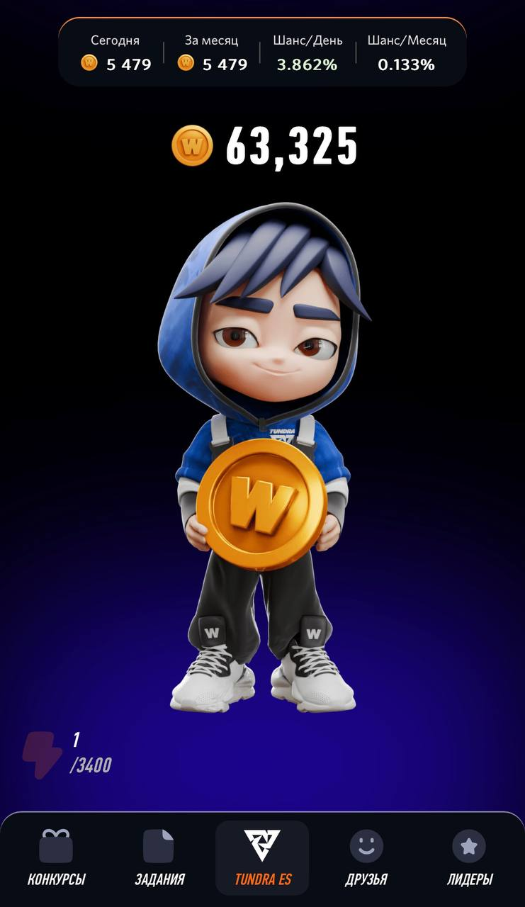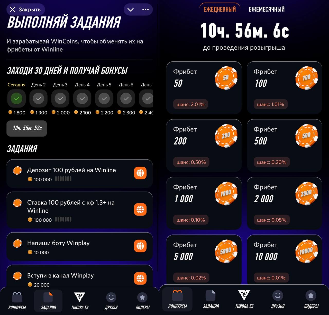 Суть предельно ясная — чистый аналог хомяка: нажимаешь на экран, получаешь за это монетки, которые затем дают право участвовать в ежедневных и ежемесячных розыгрышах фрибетов. Кроме того, аккаунт Winplay привязан к счёту в Winline, и за выполнение заданий (в основном это депозиты и ставки) можно получать дополнительные коины. Чем их больше, тем выше шанс залутать фрибет (но гарантий никаких нет — рядом с каждым номиналом фрибета просто указана вероятность его выпадения).