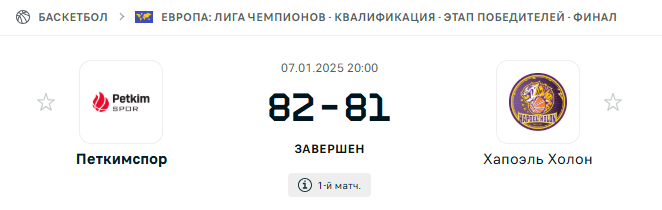 Но теперь, чтобы остаться в турнире, «Хапоэлю» в ответной личке придётся обыграть «Петкимспор» крупнее. Турки уже продлили свою победную серию до рекордных трёх игр в турнире. Израильтяне же уступили дважды подряд — лишь раз с сезона-2020/21 у них набиралась более затяжная лузовая серия (пять игр в 2023-м).