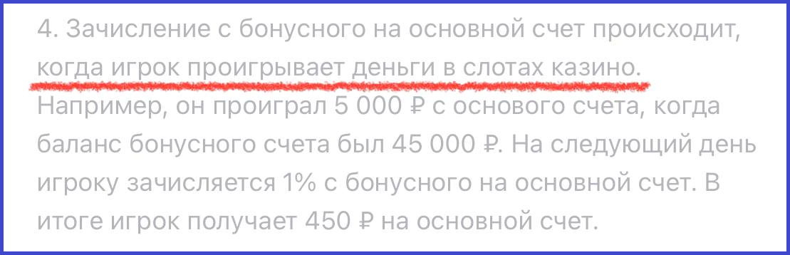 Всё верно: чтобы забрать свой бонус за депозит, вам нужно проигрывать свои деньги с основного счёта, причём проигрывать обязательно именно в слотах, а не где-нибудь ещё. И чем больше проиграете, тем больше получите — от 1% до 20% в сутки от суммы, лежащей на бонусном счёте (20% выдадут, если чистый проигрыш за сутки превысит миллион рублей). Фактически этот самый «бонус +500% на депозит» есть не что иное, как просто кешбэк в слотах. Не дайте себя обмануть!