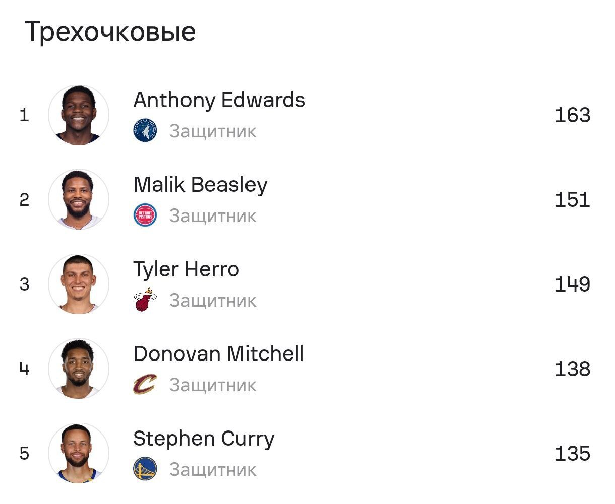 Новый король по трёшкам — Энтони Эдвардс из «Миннесоты», который опережает Карри ещё и по проценту попаданий (42,2% против 41%). Ночью снайперы столкнутся на одном паркете, но индивидуальный тотал дальних попаданий Стефена всё равно выше, даже на кольцах в Миннеаполисе — домашних для «Тимбервулвс».
