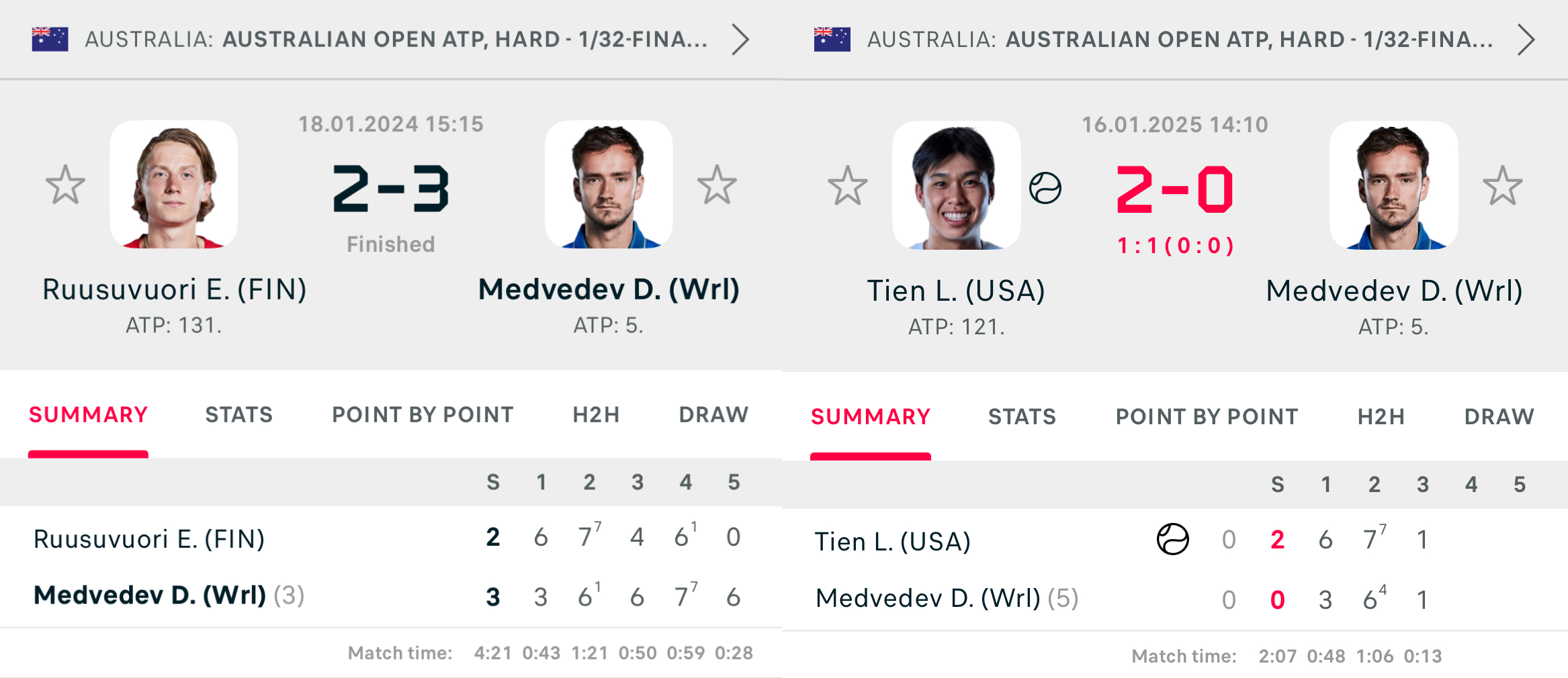 В третьем сете Тьен подаёт первым — одного брейка от Медведева как раз будет достаточно. Проверяем ТС 4:6 за 3.45