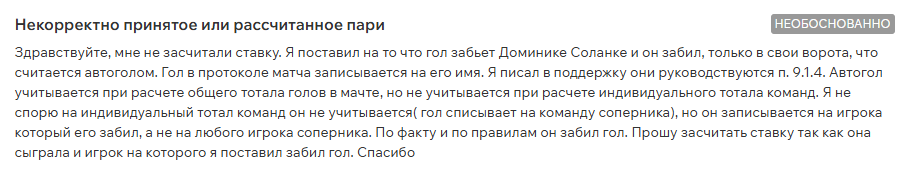 Ещё один интересный кейс из раздела жалоб на сайте Legalbet. Клиент поставил на гол Доминика Соланке в ворота «Арсенала», нападающий забил, правда, в свои ворота (в чужие — не получилось). Ставка была рассчитана, естественно, проигрышем, но это вызвало недовольство игрока, который посчитал, что гол — это гол, неважно, каким образом и в какие ворота он забит.