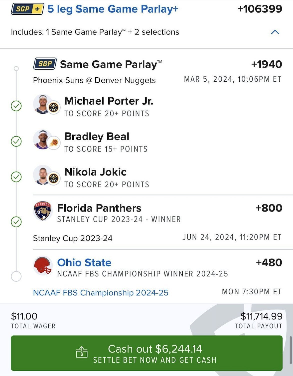Кажется, кто-то перепутал даты в прошлом году, собрав экспресс из пяти событий на 11 долларов. Три события из пяти — индивидуальные действия игроков в матче «Финикс» — «Денвер» в ночь на 6 марта 2024 года. Другие два прям совсем не близко — победа «Флориды» в Кубке Стэнли (финал сыграли 24 июня) и победа «Огайо Стэйт» в NCAA по американскому футболу.