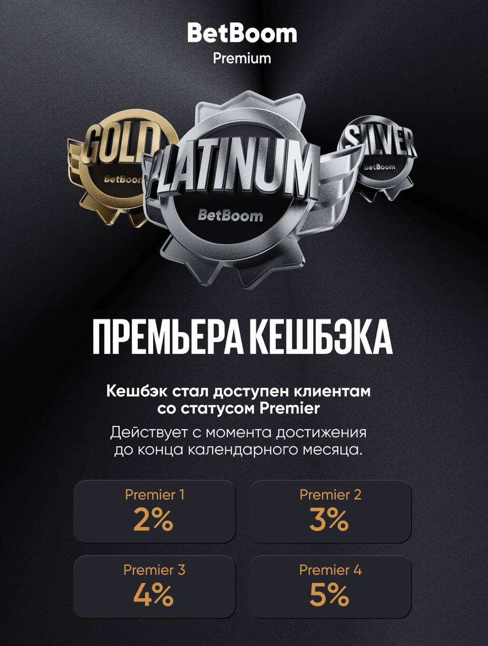 В обновлённой программе лояльности (Boom Статус) кешбэк становится доступен и игрокам, имеющим статусы Premier (в дополнение к фрибетам за получение статуса):