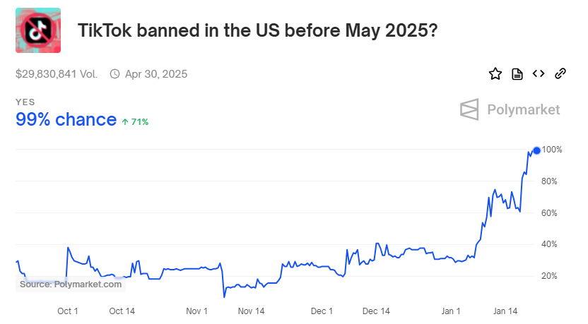 После этого приложение снова стало доступно. Но это временно — считает большинство ребят, набивших на Polymarket почти 30 млн долларов оборота по линии «TikTok забанят в США до мая 2025-го». Коэффициент практически не оставляет шансов для других вариантов — 99% или 1.01.
