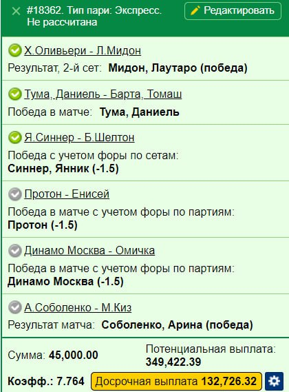 После победы Синнера над Шелтоном экспресс можно было выкупить за 132+ тысячи, сейчас коэффициент гораздо выше изначального.