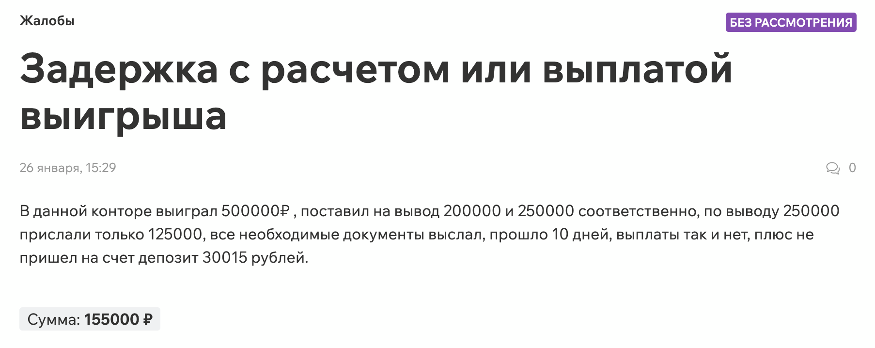 История из жалобы, которая прилетела в Арбитраж Legalbet: игрок поднял в офшорной конторе 500 тысяч рублей и запросил два вывода — 200 и 250 тысяч. О судьбе первой суммы автор умолчал, это останется тайной, а вот со второй что-то не так: на счёт упали только 125к, то есть ровно половина. Клиент прислал все необходимые документы, но оставшиеся средства так и не пришли, да и депозит в размере 30 тысяч ему также не вернули.