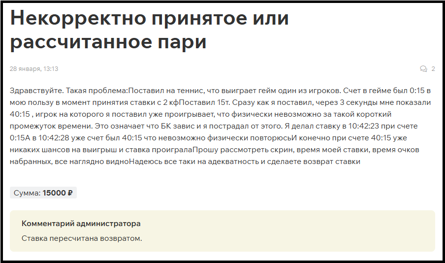 Именно такая история произошла с одним из клиентов Fonbet: он поставил 15 тысяч рублей на победу принимающего игрока в гейме теннисного матча при 0:15 (то есть его игрок вёл в счёте) с коэффициентом 2.00. Но уже через пять секунд счёт внезапно изменился на 40:15. Очевидно, три очка за эти пять секунд никак не могли быть сыграны — так что у букмекера явно случился какой-то сбой, из-за которого текущий счёт отображался неверно.