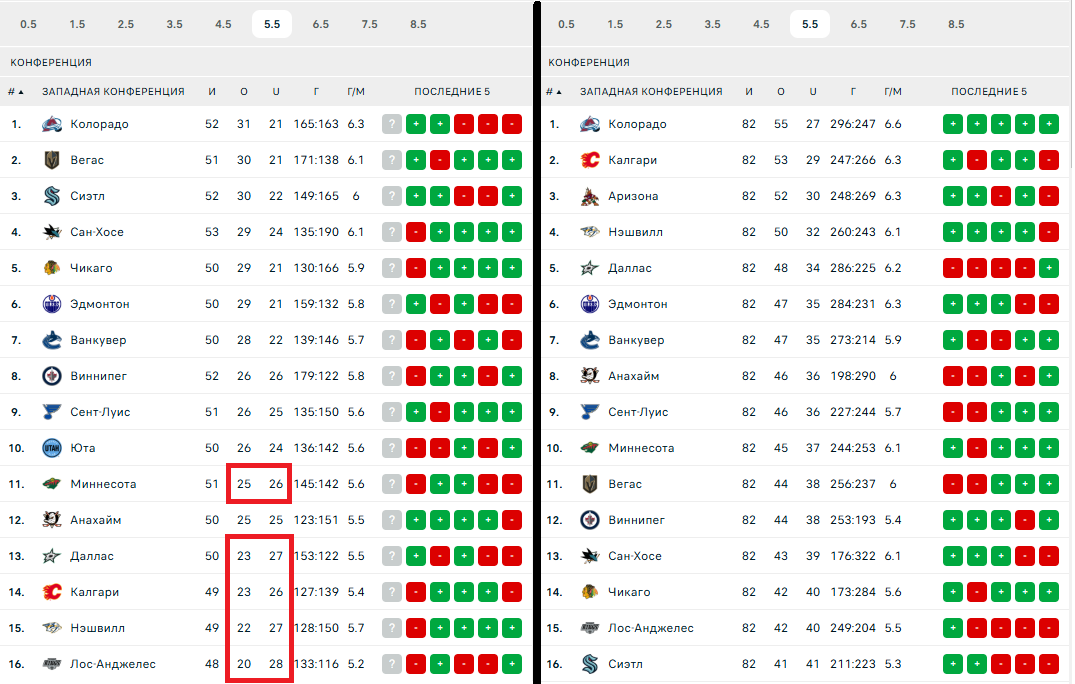 Кстати, если исключить 30 январских голов в овертаймах, останется вообще всего 1220 шайб в основное время — или 5,55 за матч. Да и в принципе чтобы заметить, что тоталы в НХЛ стали пробиваться крайне неохотно, достаточно просто открыть Flashscore. К примеру, в прошлом сезоне в Западной конференции не было ни одной команды, которая сыграла бы на ТМ 5,5 больше матчей, чем на ТБ, — хуже всех в этом плане был «Сиэтл» с 41-41. В этом сезоне на Западе таких клубов аж пять: