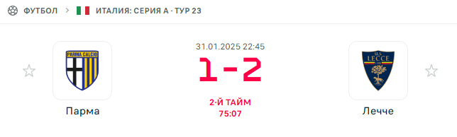 Сегодня «Лечче» снова близок к победе — в середине второго тайма счёт 2:1. При этом гости проявили ещё и волевые усилия, не бросили играть даже после незабитого пенальти и пропущенного гола — отыгрались до перерыва, а во втором тайме вышли вперёд.