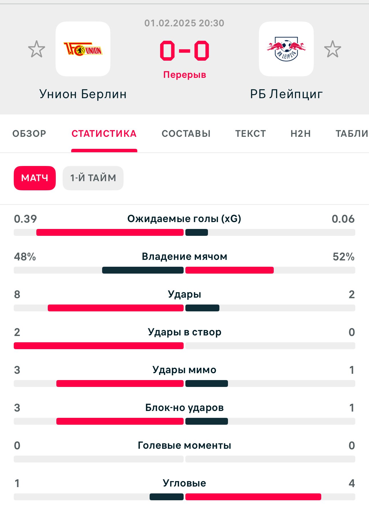 Сегодня команду прорвало: «Лейпциг» в гостях у «Униона» нанёс всего два удара в сторону ворот (ни разу в створ), зато заработал аж четыре угловых за первый тайм.