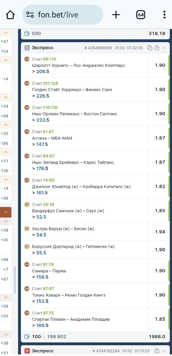 Автор ставки прислал скриншот купона в чат игроков Fonbet в Телеграме, когда 10 из 12 событий уже зашли, а ещё два оставались: сумма — всего 100 рублей, коэффициент — 1988.00, потенциальная выплата — 198 802 рубля. И как вы уже поняли из заголовка, это месиво из тоталов больше в баскетболе и гандболе в итоге зашло: «Хаслум» и «Бясен» накидали 58 мячей, а «Дортмунд» и «Геппинген» — целых 62, и сотка превратилась почти в 200 тысяч.