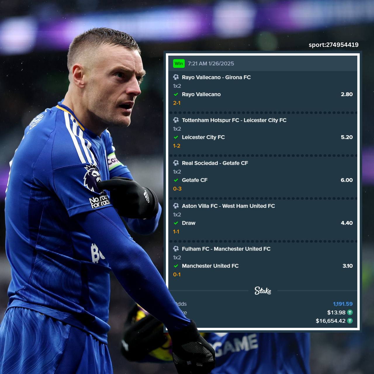 Американская букмекерская контора Stake поделилась купоном своего клиента с коэффициентом 1191.59, который зашёл на прошлой неделе. Тактика предельно понятна: четыре победы андердогов плюс ничья в матче «Астон Вилла» — «Вест Хэм» (не брать же П2 за 6.60, ну!).