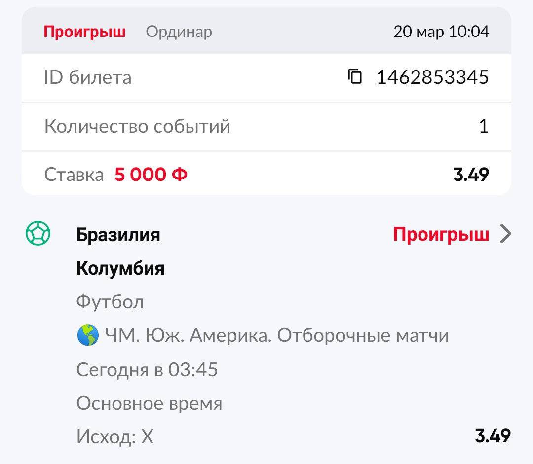 На этот раз провинился Винисиус — в матче против Колумбии закинул из-за штрафной буквально на последних секундах. И заодно лишил Сергея Шведова захода ничьей за 3.49, которая превратила бы фрибетные 5000 в 12450 рублей чистыми.