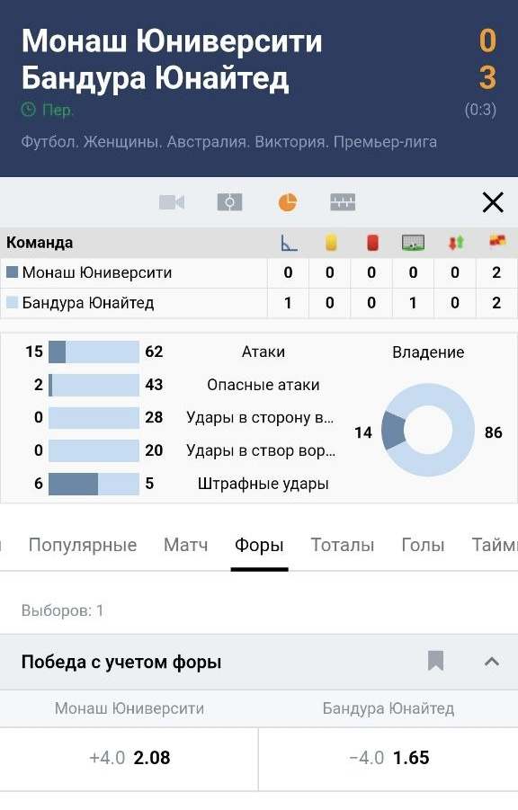«Бандура Юнайтед» в первом тайме уничтожила соперника по всем показателям — от владения мячом до ударов. Фаворит забил три мяча, а в перерыве букмекер предложил фору (–4), когда нет ни одной предпосылки, что аннигиляция «Монаш Юниверсити» прекратится. Минусовая явно занижена на пару пунктов.