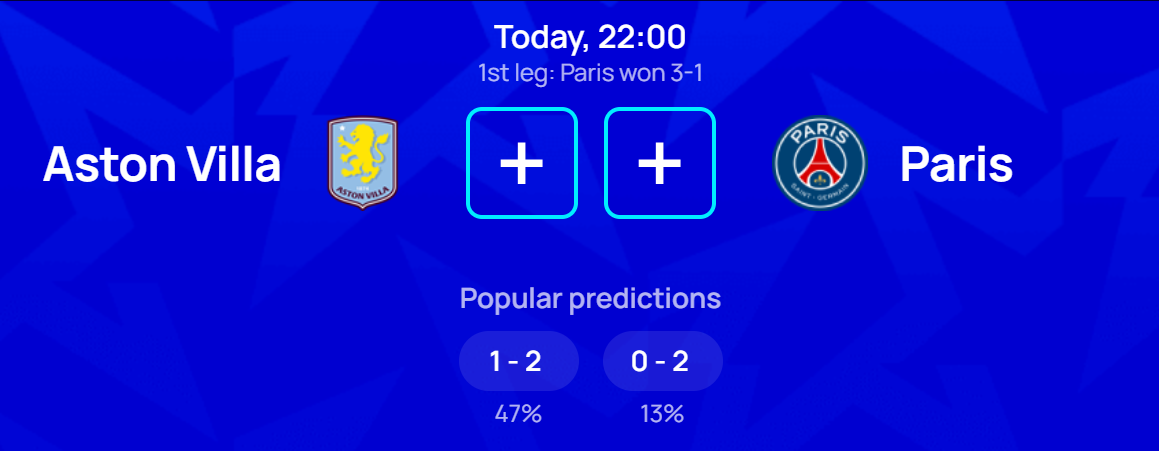 Сегодня как минимум в Бирмингеме для коллективного разума всё максимально предсказуемо: почти половина участников игры уверенно зарядила на точный счёт 2:1 в пользу «Парижа» — 47%. Второй по популярности вариант — победа гостей 2:0 — собрал почти в четыре раза меньше голосов (13%)!