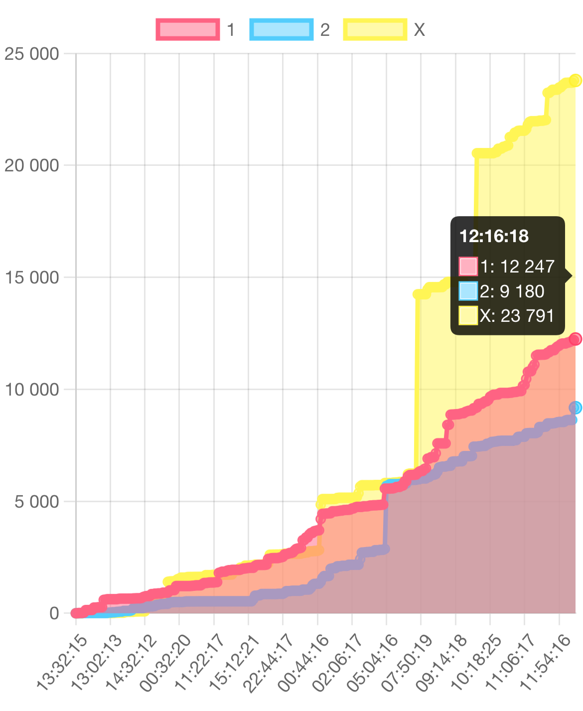 Сначала ничью стали подгружать постепенно, но в 06:36 МСК на Х прилетели 8 тысяч буквально в течение пары минут. Вероятно, это вообще одна ставка.