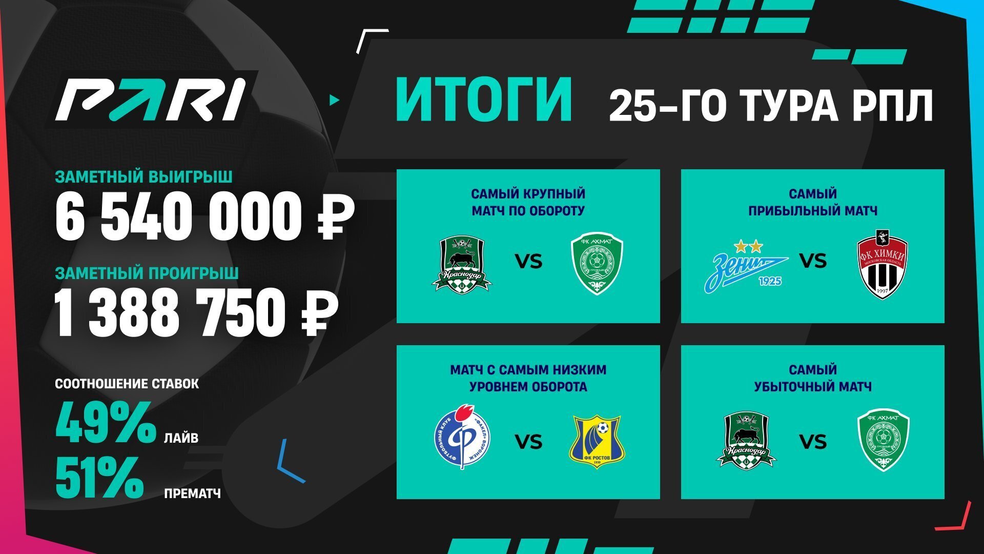 PARI плюсанул только на играх «Зенит» — «Химки» и ЦСКА — «Крылья Советов». Для клиентов прибыльными стали все оставшиеся пары, а наиболее: «Акрон» — «Спартак» и «Краснодар» — «Ахмат».