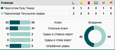 В первом тайме «Персипегаф» отыграл с небольшим преимуществом: статистика в «Марафоне» утверждает, что хозяева поля ни разу за 45 минут не ударили по воротам. Но и у гостей ударов набралось всего два, а перевес по атакам и владению минимальный: