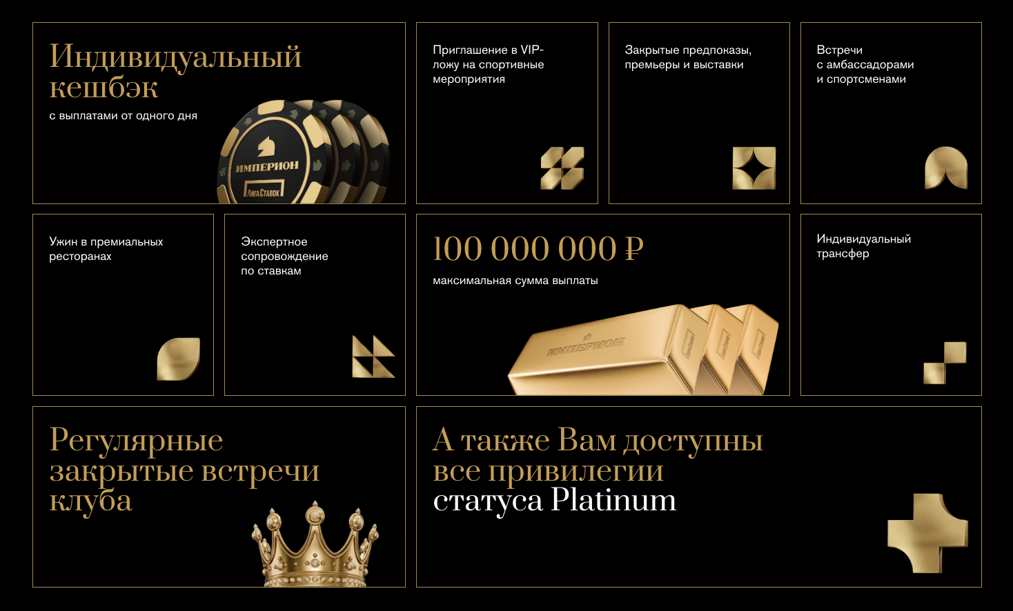 — эксклюзивные привилегии: приглашение в VIP-ложи на спортивные события; закрытые предпоказы, премьеры и выставки; встречи с амбассадорами БК и многое другое.