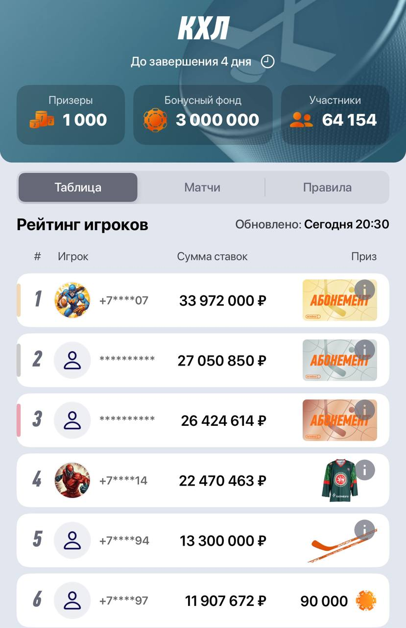 И если победитель получит хотя бы абонемент категории «Премиум», то третьему достанется вообще лишь «Стандарт», который у большинства клубов стоит около 20-30 тысяч рублей. Ещё раз: человек уже прокрутил 26,5 миллионов и проставит ещё столько же за вторую неделю, а в итоге получит только абонемент на КХЛ стоимостью примерно в 30 тысяч — реальных денег или фрибетов для топ-5 не предусмотрено.