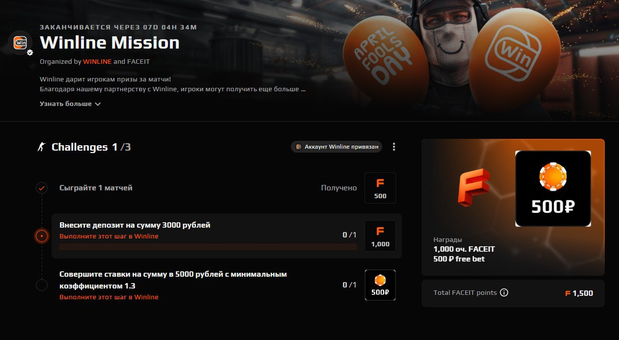Работает это так: в FaceIt — платформе по подбору матчей для игроков в CS2 — существуют Winline Missions, в рамках которых можно получать фрибеты в Winline и очки FaceIt за выполнение заданий. Сами задания стандартные, но обычно требуют выполнения действий на обеих платформах: например, сыграть матч в FaceIt и пополнить счёт в Winline. А ещё FaceIt даёт возможность верифицировать профиль через свой аккаунт в букмекерской конторе.