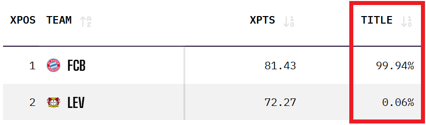 Именно такой расклад за три тура до конца чемпионской гонки в Бундеслиге выдаёт Opta. «Бавария» впереди «Байера» на восемь очков при разнице голов +61 против +31 у Леверкузена (а в Германии первым критерием при равенстве очков является именно разница), поэтому единственный сценарий, при котором Мюнхен упустит чемпионство — три поражения в трёх оставшихся играх с «Лейпцигом», «Гладбахом» и «Хоффенхаймом» + три победы «Байера» над «Фрайбургом», «Дортмундом» и «Майнцем».