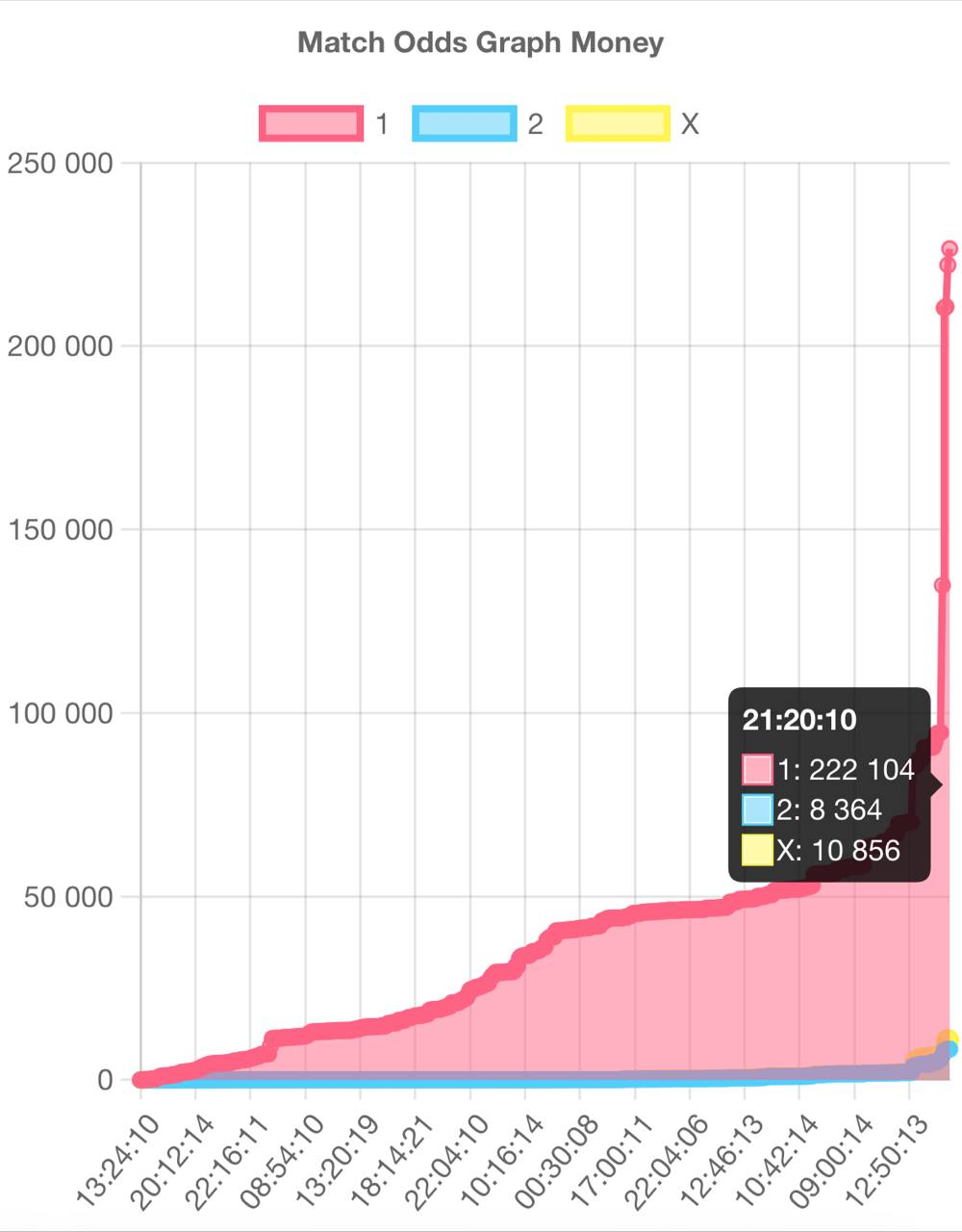 За час до домашней встречи с «Ванкувером» на «Миннесоту» уже было проставлено 90 тысяч евро — примерно в 20 раз больше, чем на гостей, но в течение следующих 30 минут (сразу после публикации составов) на «Миннесоту» прилетело ещё 150 тысяч! В итоге хозяева, открывшиеся по 2.60, то есть на равных с соперником, теперь идут явными фаворитами всего за 1.65.