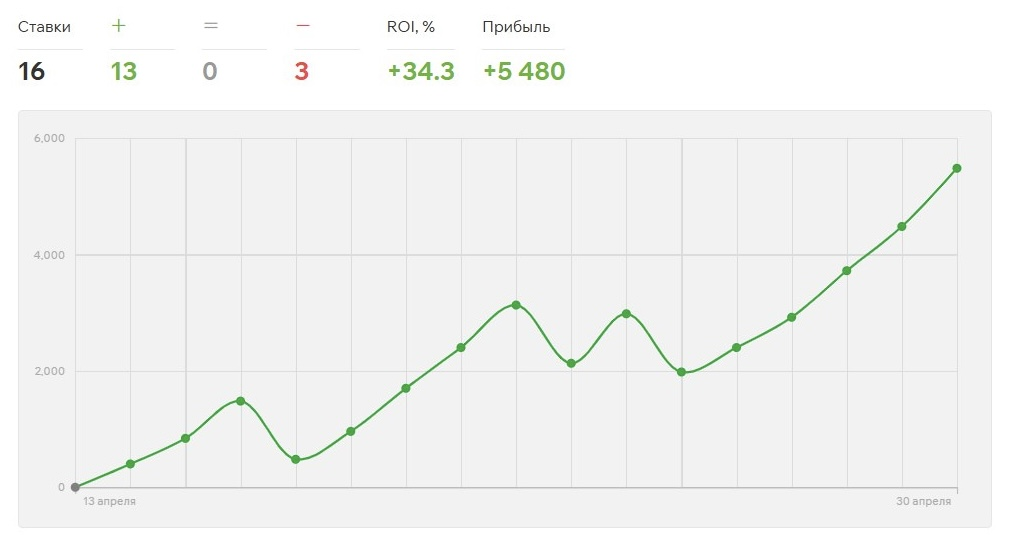 Прямо сейчас маэстро идёт на винстрике из пяти зашедших прогнозов, а за последние 30 дней выдал мощнейшие 34,3% ROI.