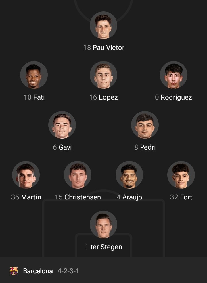 В обоих матчах недели в стартовом составе каталонцев вышли только Мартен и Педри. А ещё в воротах «Барселоны» впервые после травмы появился тер Штеген, немец не выступал с сентября 2024-го.