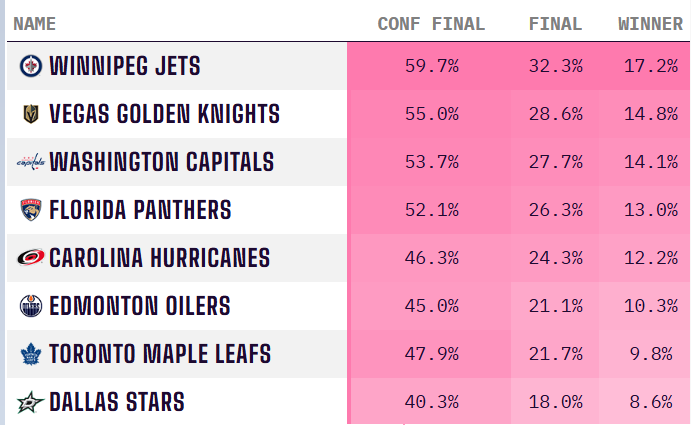 Перед полуфиналами конференций суперкомпьютер считает «Виннипег» главным претендентом на трофей в этом сезоне: на титул «Джетс» Opta даёт 17,2%, а дальше даже небольшой отрывчик есть — у остальных семи клубов меньше 15% на победу. К слову, этой ночью «Виннипег» стал последним участником 1/2 финала конференций, отыгравшись в седьмом матче с «Сент-Луисом» за 1,5 секунды до конца основного времени и затащив во втором овертайме.