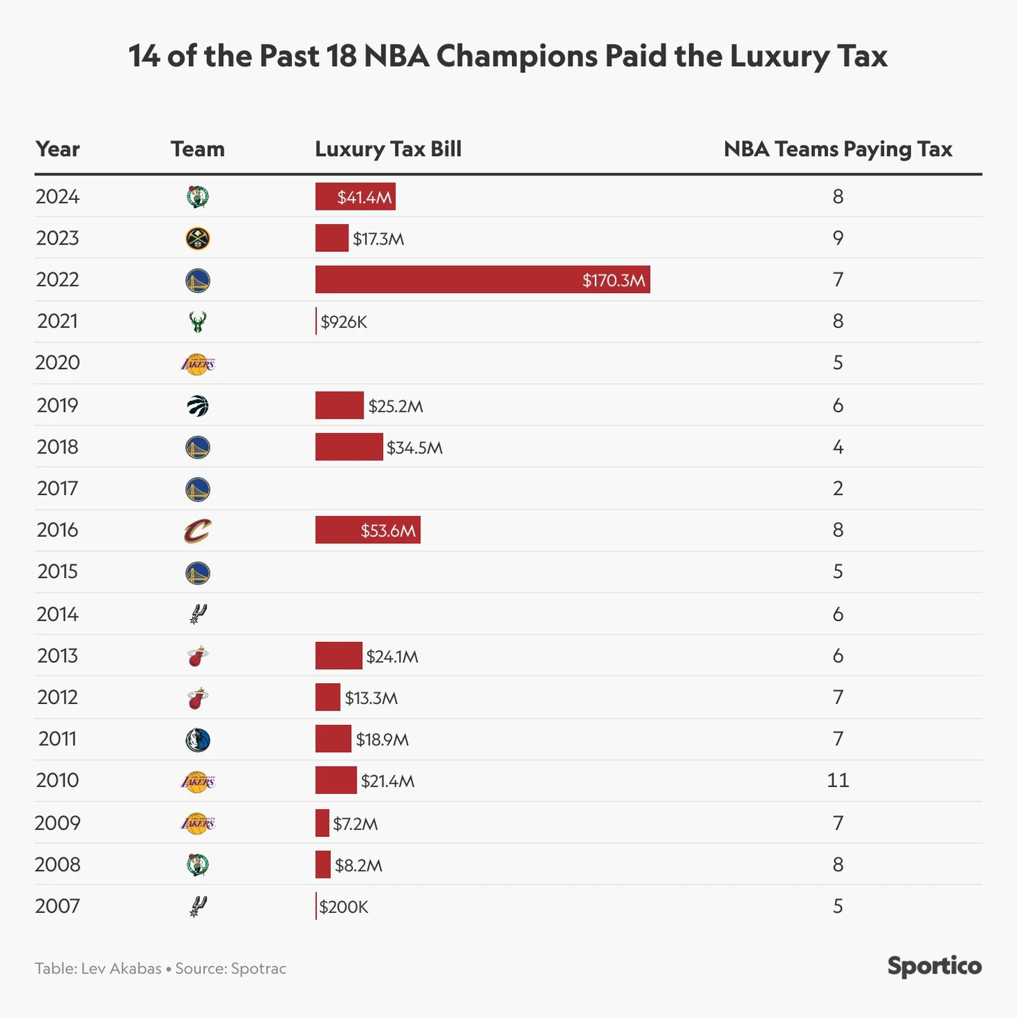 Клубы, вынужденные платить этот налог, обычно в меньшинстве: максимум за последние 18 сезонов — 11 команд-нарушителей в 2010-м, а чаще всего эта цифра колеблется в районе 6-8. Казалось бы — шанс победы именно такого клуба не очень велик, потому что их всего лишь 20-25% в лиге, но на деле-то всё наоборот: 14 из 18 последних чемпионов НБА налог на роскошь платили!