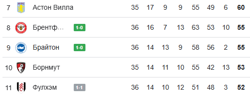 Перед туром восьмое место удерживал «Борнмут», но в лайв-таблице его уже обходят «Брентфорд» и «Брайтон». Вернуться обратно «Борнмуту» удастся только в случае домашней победы над «Астон Виллой». Впрочем, у гостей свои задачи — попытка забраться в Лигу чемпионов.