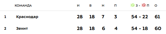 На деле лидер РПЛ подпортил себе шансы на чемпионство поездкой в Москву. До 28-го тура «Краснодар» увозил из столицы только победы, но последнего босса в виде ЦСКА так и не прошёл — 0:1. Зато «Зенит» не ошибся в Махачкале — закрыл местное «Динамо» с тем же счётом.