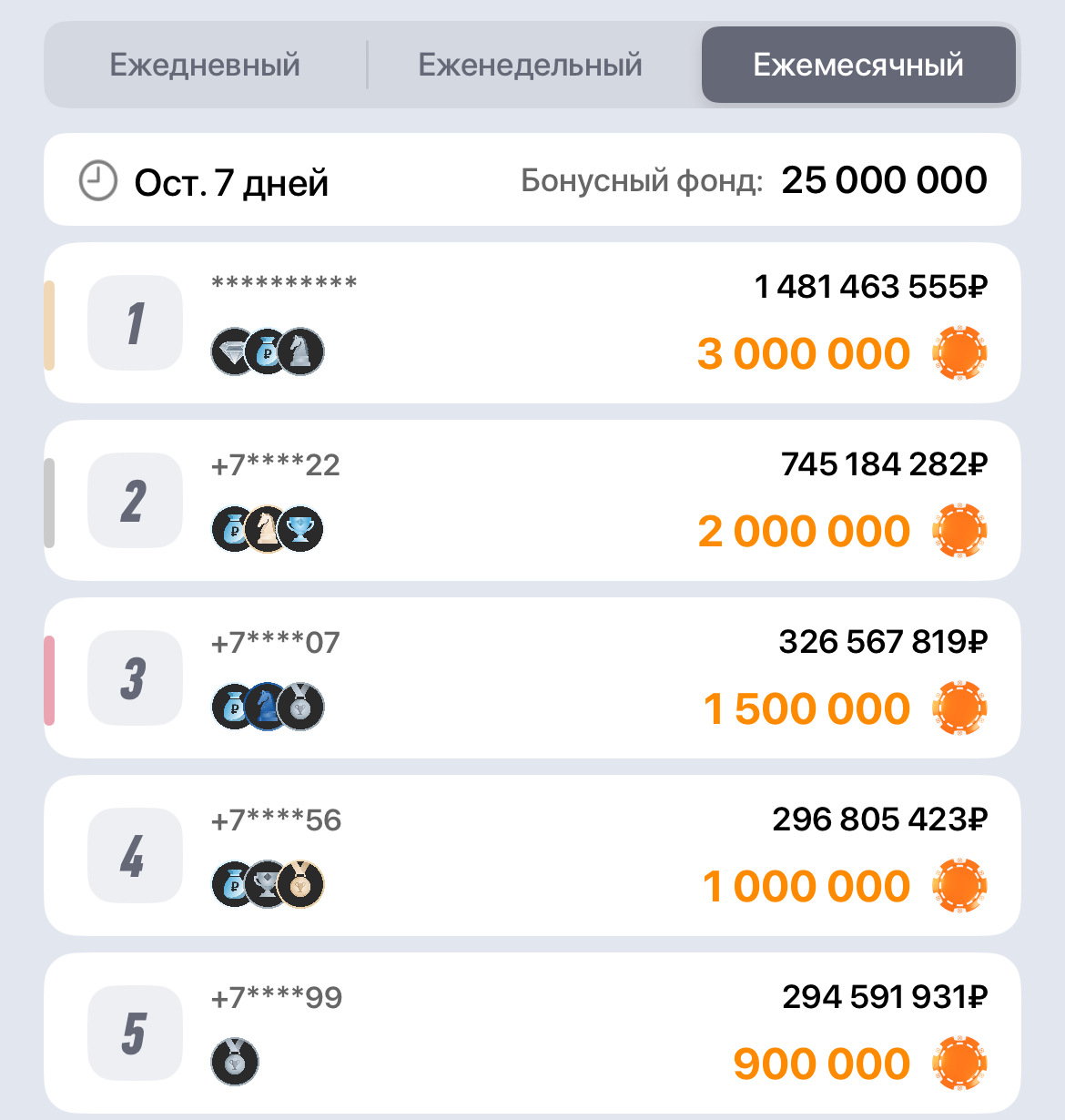 И что шейх за это получит? За ежедневный конкурс — 250 тысяч фрибетами; за еженедельный — от 450 до 500 тысяч (пока он второй); за ежемесячный — 3 млн.