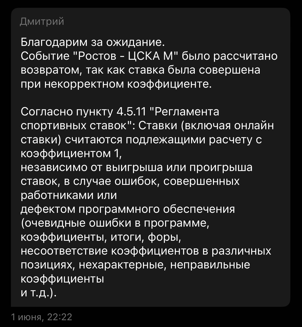Саппорт всё расписал, ошибка действительно была (вспоминаем кэфы того же Fonbet), но читателям Legalbet Дейли, пульнувшим на «Ростов» за 11.00, это сыграло на руку — вернули даже проигранные пари. Респект BetBoom за признанную ошибку и соболезнования тем, кто успел порадоваться зашедшим 10.00 на выигранную серию от ЦСКА.