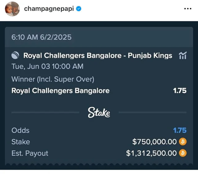 Если смотреть историю музыканта с 2022 года, то он в плюсе: зарядил 76 раз — $33,4 миллиона ставок и $34,8 миллиона выигрышей. Прошло 29 пари при средней ставке в 435 тысяч. Кстати, конкретно на крикет Дрейк сделал всего две ставки из этих 76 — и обе зашли (ROI — +48,3%)!