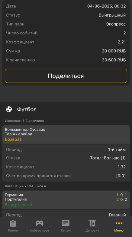 Как оказалось, в приложении команды перепутали, как будто дома играл «Вёльсунгюр». На скриншоте купона это тоже видно. И конкретно в этой БК всё по правилам: в пункте 6.17 сказано, что в случае очевидных ошибок в программе пари будет рассчитано с кэфом 1.00.