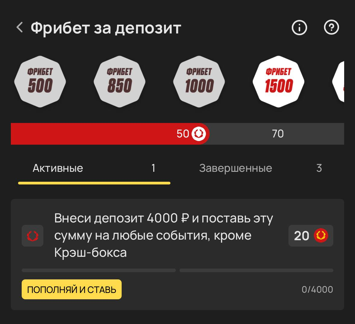 Фрибетов в акции, кстати, можно получить аж 15 штук, причём максимальный — номиналом в 100 тысяч рублей. Этап «Фрибет за депозит» будет активен три дня — выполнять задания можно до 23:59 МСК 20 июня. На всякий случай предупреждаем: пополнить, поставить на 1.01 и сразу вывести не получится — согласно пункту 5.17 правил OLIMPBET, для вывода нужно сделать ставку хотя бы на 50% от депозита с кэфом не ниже 1.50.