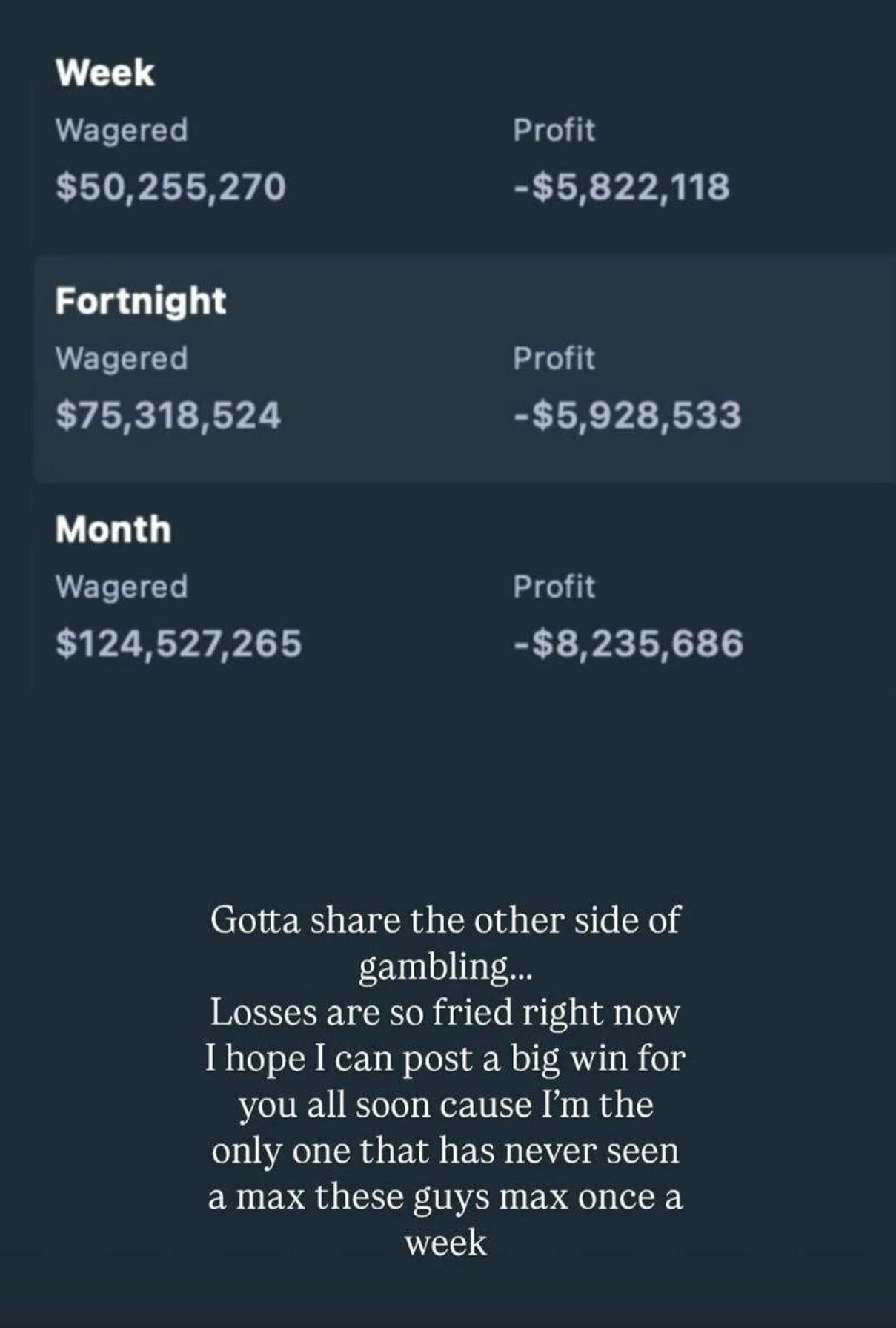 Минуса действительно дикие: только за последнюю неделю Дрейк слил 5,8 миллиона долларов, а за месяц накопилось уже –8,2 миллиона. Общий оборот ставок тоже впечатляет: почти 125 миллионов за месяц (около 10 миллиардов рублей). Получается, музыкант лудит по-крупному и никому об этом не рассказывает: в соцсетях с начала мая Дрейк опубликовал всего лишь два купона — 1 миллион долларов на Кубок Стэнли (проиграл) и 750 тысяч на индийский крикет (выиграл). Но на 125 миллионов тут явно не набирается.